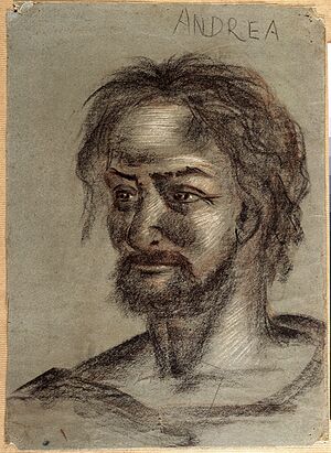 With gentle hazel eyes[2], rather small, shy, sensitive and reserved, blushing easily, but praying. He feels self-conscious due to the exuberant character of his brother, who often rebukes him. He says to Jesus:"Alone and speaking alone to you, I still know how to manage just a little bit. But if others know, and Simon especially, and if he wants to come ... I don't know how to do anything anymore... And you don't come either... because I am ashamed to speak in front of you."[3]Peter his brother says of him: