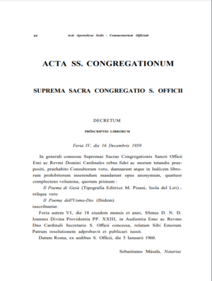 4. Translation of the decree: "Supreme and Sacred Congregation of the Holy Office - DECREE - Prohibition of books - Friday, December 16, 1959. In general assembly of the Supreme and Sacred Congregation of the Holy Office, their Eminences the most Reverend Cardinals charged with vigilance in matters of faith and the Protection of morals, with the prior assent of the Consultors, condemned an anonymous work, consisting of four volumes, the first entitled "Il Poema di Gesù" (Publisher M. Pisani, Isola del Liri) and the rest "Il Poema dell’Uomo-Dio" (ibid) and ordered its insertion in the list of prohibited books. And on Friday the 18th of the same month and year, His Holiness D. N. D. IOANNES, by divine Providence Pope XXIII, approved, in the audience granted to his Eminence the reverend Cardinal Secretary of the Holy Office, the decree that was proposed to him by their Eminences and ordered its publication. Given in Rome, at the bureau of the Holy Office, January 5, 1960. Sebastian Masala, notary (apostolic)."